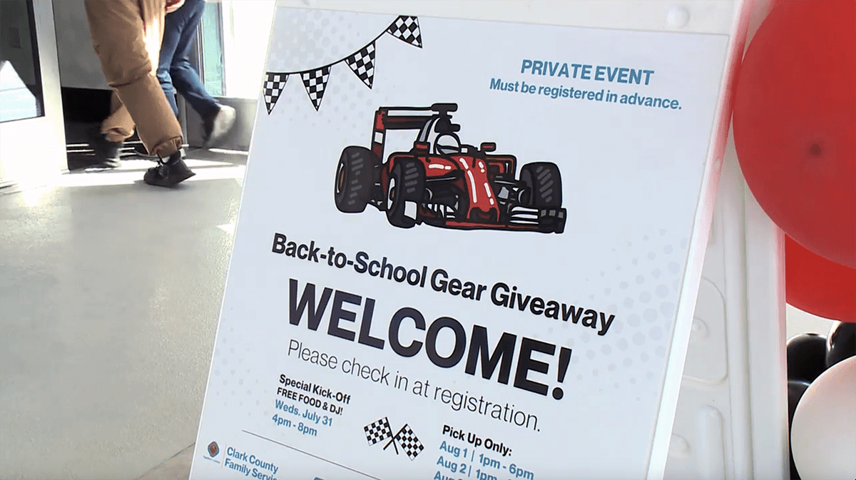 El Condado Clark, en colaboración con un grupo de socios comunitarios, efectuó su feria anual de regreso a clases, destinado a ayudar a los niños en hogares de crianza a regresar al aula preparados y confiados. En la foto, un anuncio que daba la bienvenida a los participantes. (Foto Clark County TV)