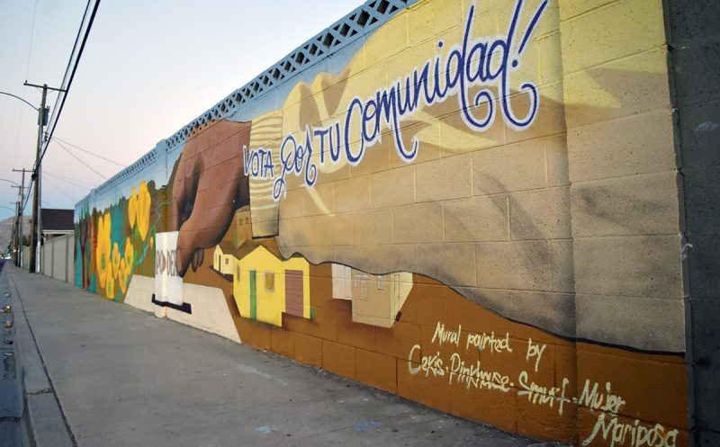 “Vota por tu Comunidad” es un mural que permite unir a la comunidad latina del valle para celebrar el arte, la cultura y el compromiso cívico. Miembros de Make The Road Nevada y del Centro para la Democracia Popular agradecen al muralista de renombre internacional Nelson Rivas “El Cekis”, así como a Nelly Tobón “Mujer Mariposa”, Pedro “Smurf” Quintanilla, Pink House Creations by Michelle Beardsley, There’s Nothing To Do in Vegas y Olmeca.