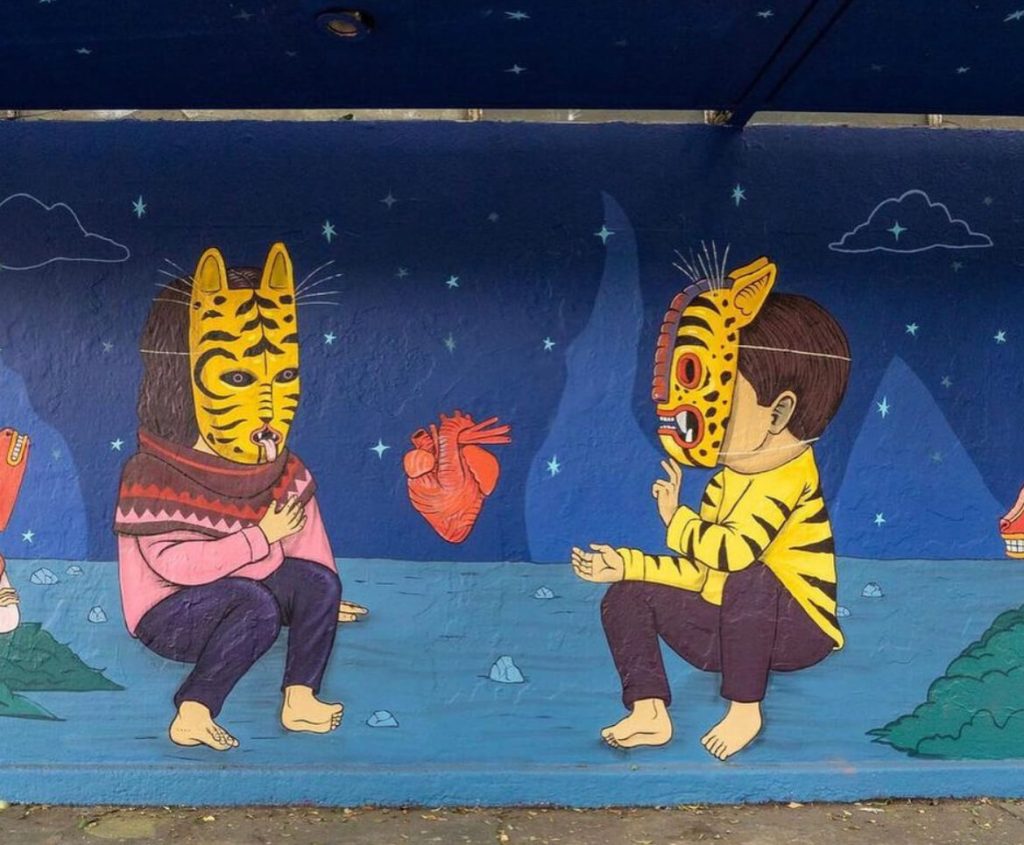 El artista Edgar “Saner” Flores pintó un mural en la calle 7 entre las avenidas Ogden y Stewart. El mural está lleno de elementos del folklor mexicano y representa una oda al amor.