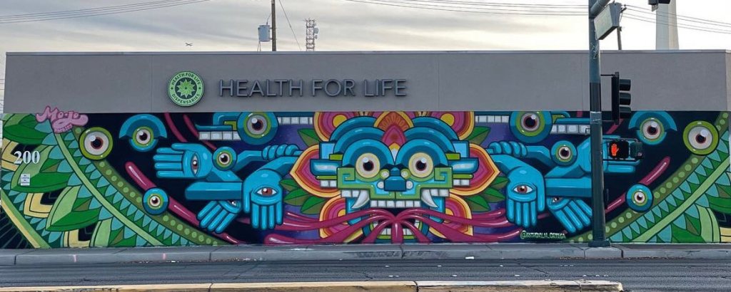 El artista Anthony Ortega pintó en la parte exterior del dispensario Health for Life, un colorido mural de una máscara azteca.