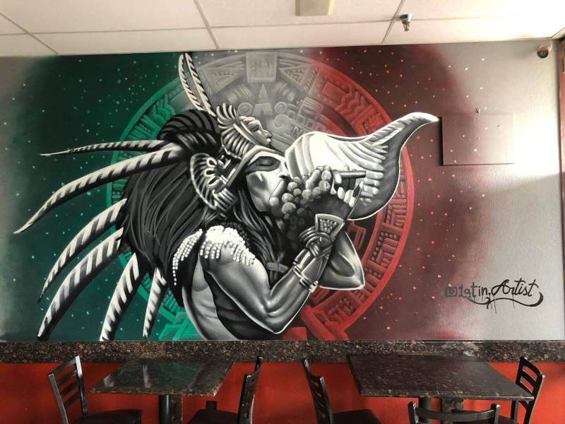El muralista Juan Ochoa realiza murales en lugares públicos y privados. Uno de sus favoritos se encuentra dentro del local de Chino’s Burgers. Se trata de una persona indígena, que se encuentra frente al calendario creado por la civilización azteca.