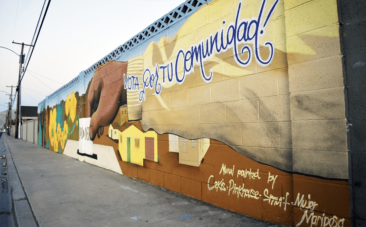 Un mural en el este de la ciudad de las Vegas permite unir a la comunidad latina del valle para celebrar el arte, la cultura y el compromiso cívico. Miembros de Make The Road Nevada y del Centro para la Democracia Popular, lo hicieron posible.