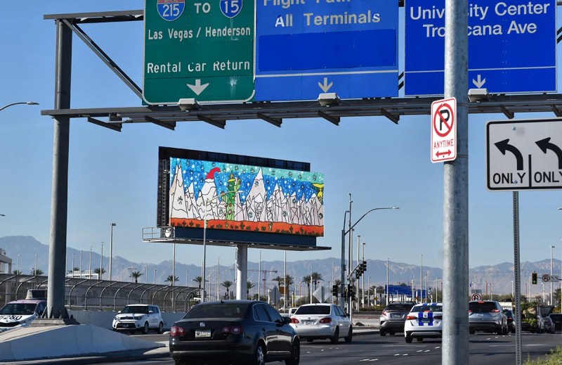 El arte de algunos estudiantes locales ocupa un lugar central en un espectacular publicitario -al aire libre- del Aeropuerto Internacional Harry Reid.