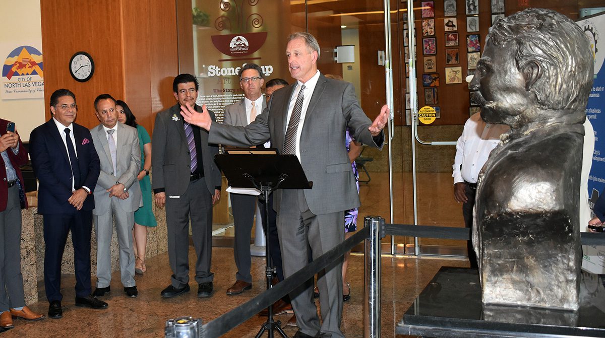 ARCHIVO – “Zapata vive y la lucha sigue”, externó Rabindrinath Salazar Solorio, subsecretario de Desarrollo Democrático, Participación Social y Asuntos Religiosos del gobierno mexicano encabezado por el presidente Andrés Manuel López Obrador, durante la ceremonia de develación del busto de Emiliano Zapata y homenaje en el Ayuntamiento de North Las Vegas. El entonces alcalde John Lee, según él amigo de los mexicanos, es flanqueado por la actual alcaldesa Pamela Goynes-Brown y Tiburcio Zapata. (Foto Frank Alejandre / The Nevadan / El Nevadense)