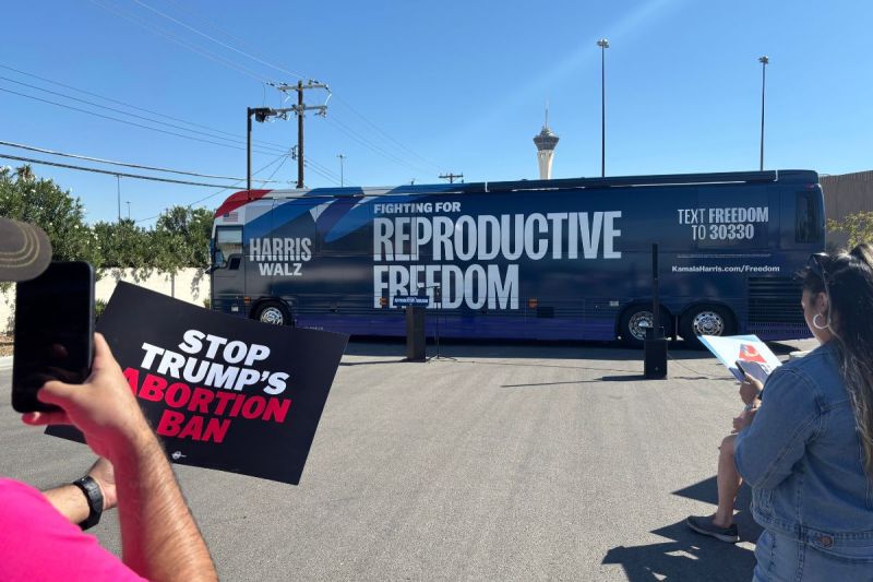 The bus stopped in Las Vegas on Wednesday and will be in Reno and Carson City over the weekend. Nevada Democratic Reps. Dina Titus and Susie Lee joined Sen. Jacky Rosen (D-NV), reproductive rights advocate Hadley Duvall, and Maya Harris, the vice president’s sister, at Wednesday’s event. They emphasized the importance of reproductive rights and warned about Donald Trump’s plans for a ban abortion.