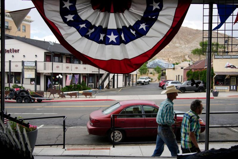 FILE – People walk along the main drag in the county seat of Nye county, Monday, July 18, 2022, in Tonopah, Nev. A new clerk was chosen Tuesday, March 19, 2024, to oversee elections in the deep-red rural Nevada county that has been roiled by false claims of widespread election fraud since 2020. (AP Photo/John Locher, File)