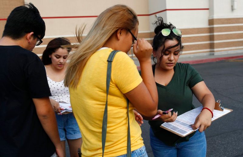 In this Aug. 15, 2018, photo, Maria Nieto, right, and Alma Romo, second from left, register people to vote in Las Vegas. Democrats in Nevada are working to register and engage Latino voters ahead of this year's midterms, hoping to recreate the big wins that the state's Hispanic and immigrant community are credited with delivering two years ago. (AP Photo/John Locher)